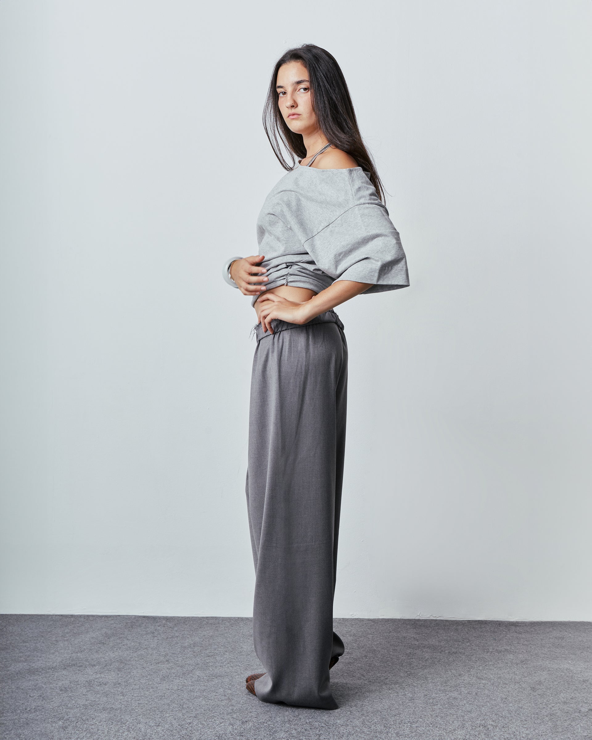 ALEX ANDRA PINTO grey melange a-symmetric t crafted from 100% cotton fabric, detailed with logo label on back, off shoulder extra wide neckline and ruched side seams and raw hem.