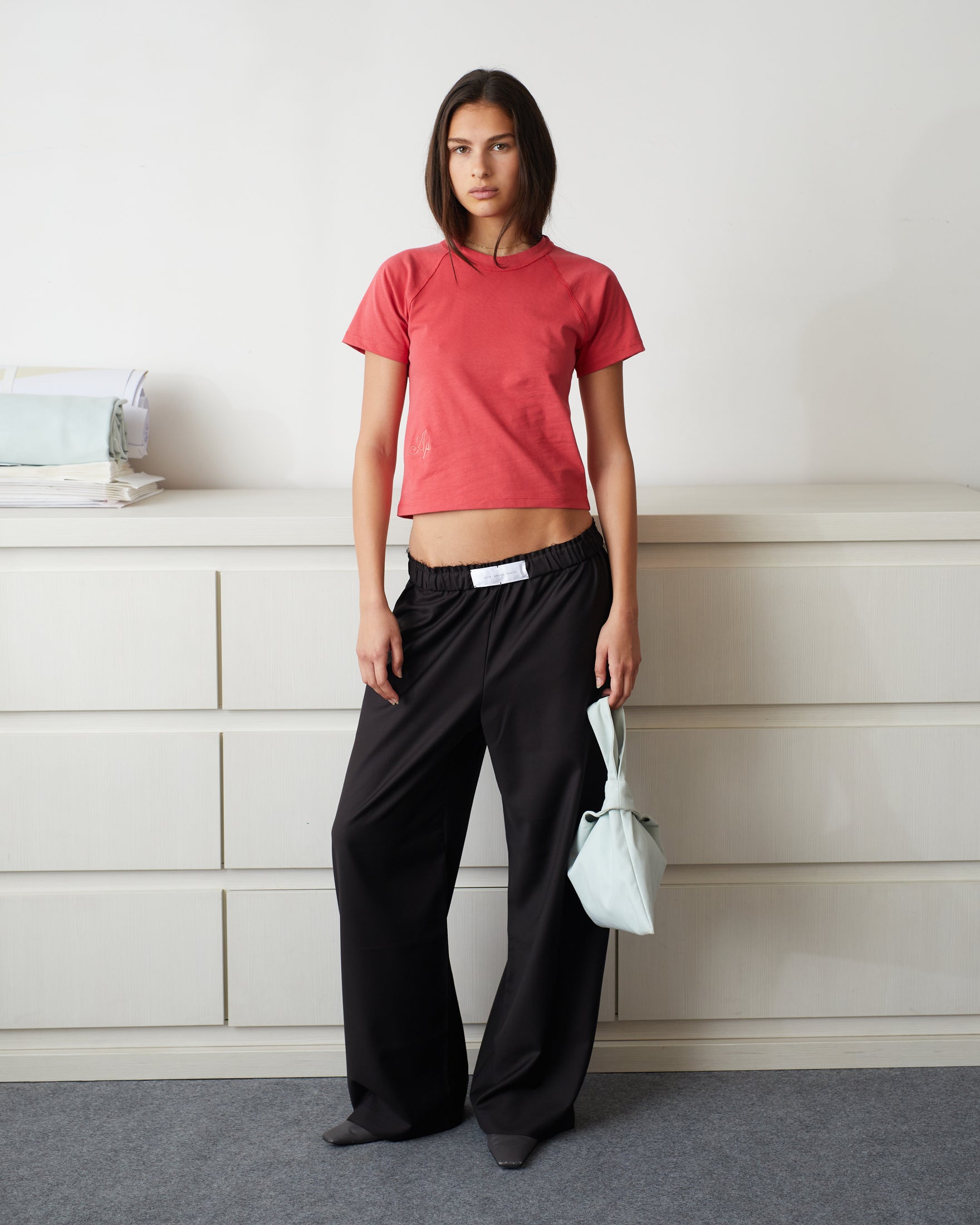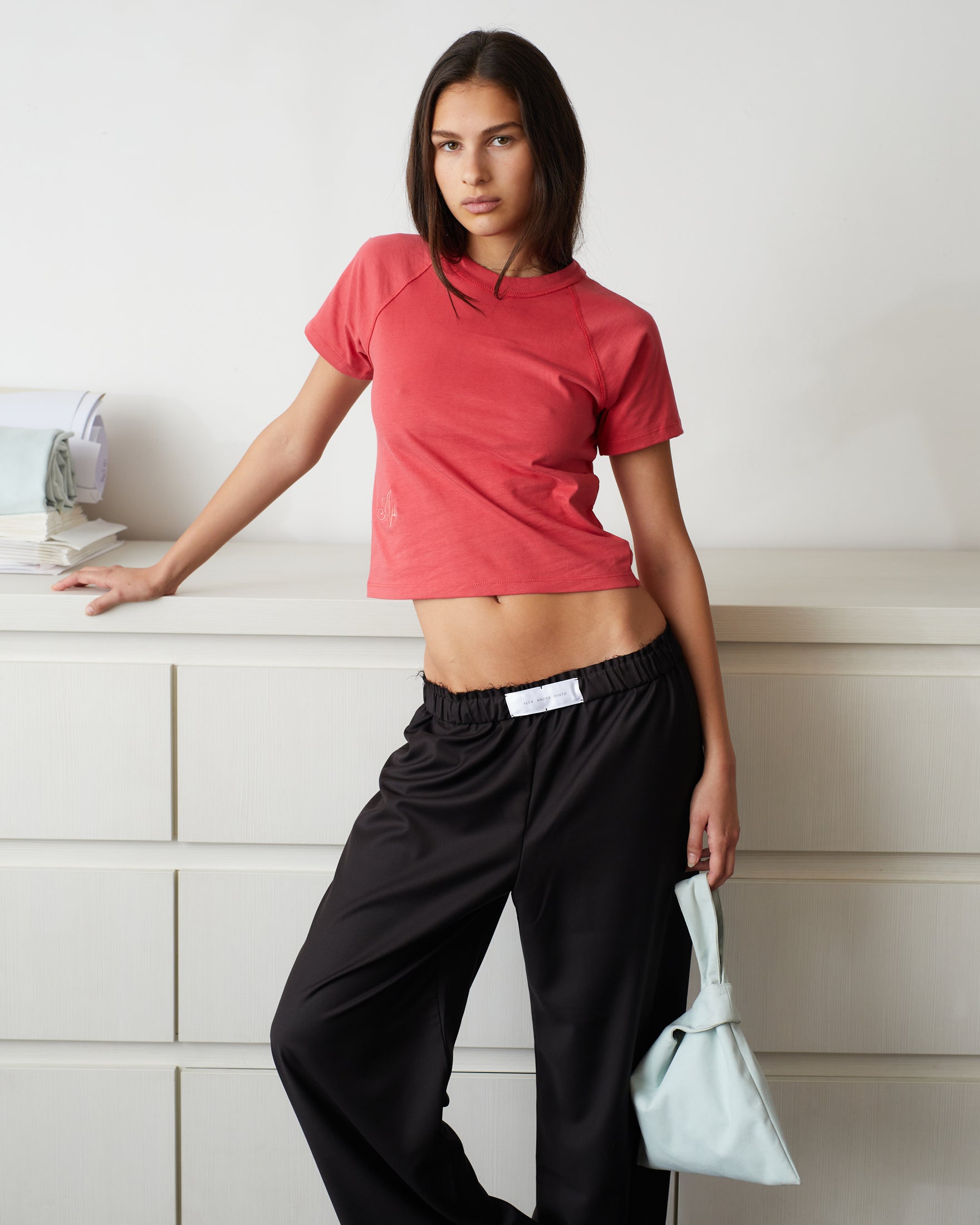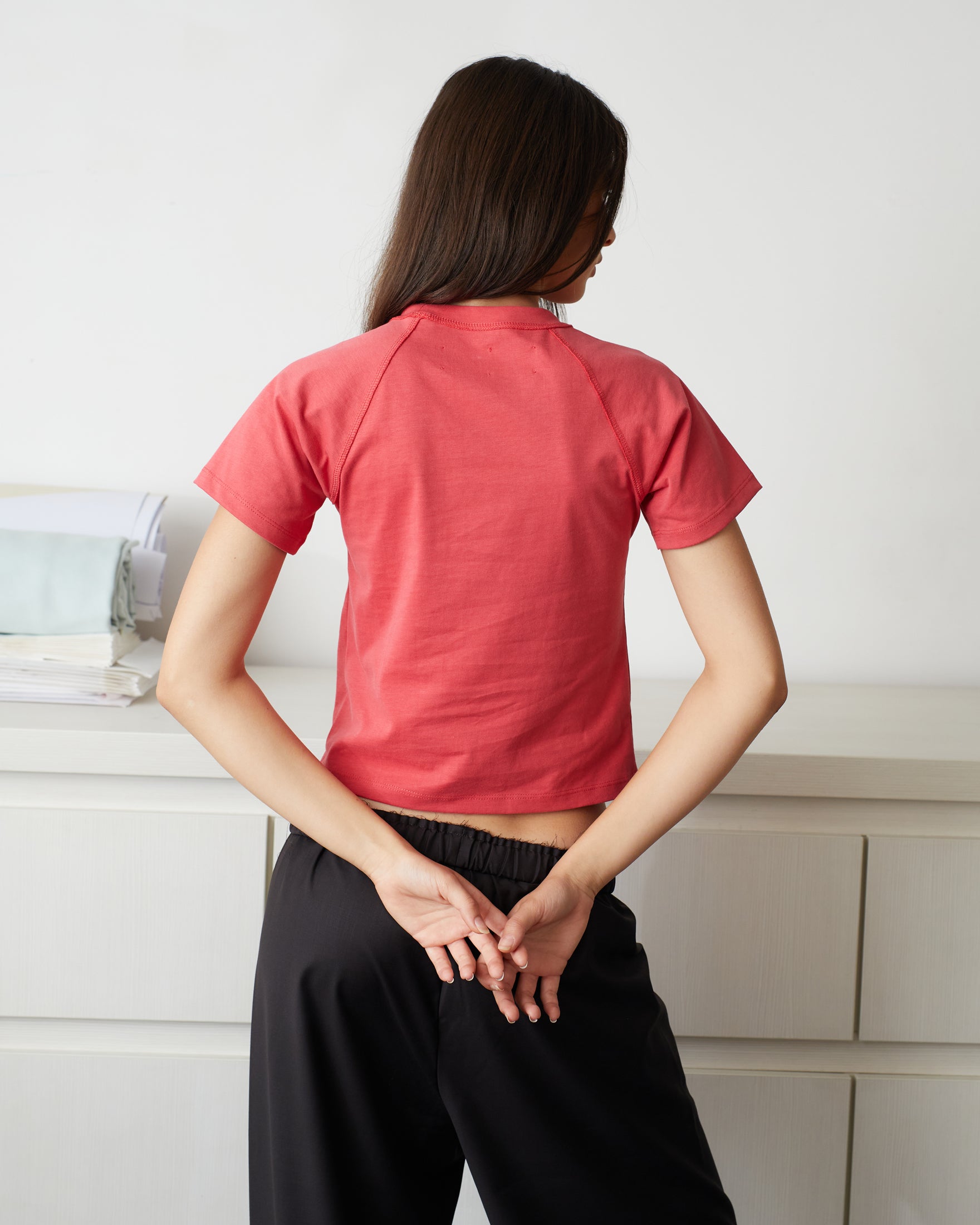 ALEX ANDRA PINTO fade red baby T raglan sleeves pattern, the mini version of our staple T-shirt. Features 'Ap' logo embroidery and inside out stitches. Made from 100% cotton fabric