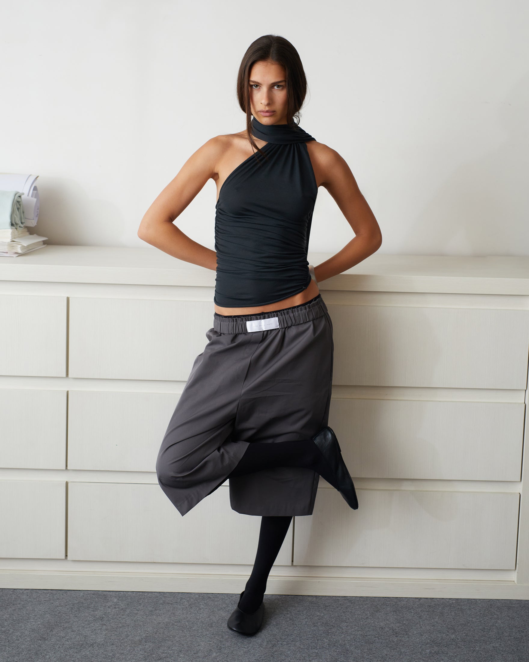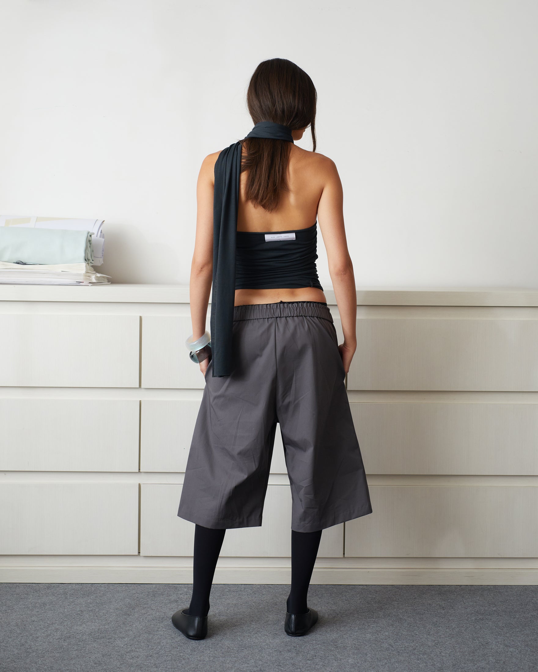 ALEX ANDRA PINTO dark grey boxer bermuda are made of 100% cotton fabric. Casual relaxed fit shorts with mid-waist and knee length. Detailed with hidden hem, side pockets, faux fly and front label on raw edge elastic waistband for extra comfort.