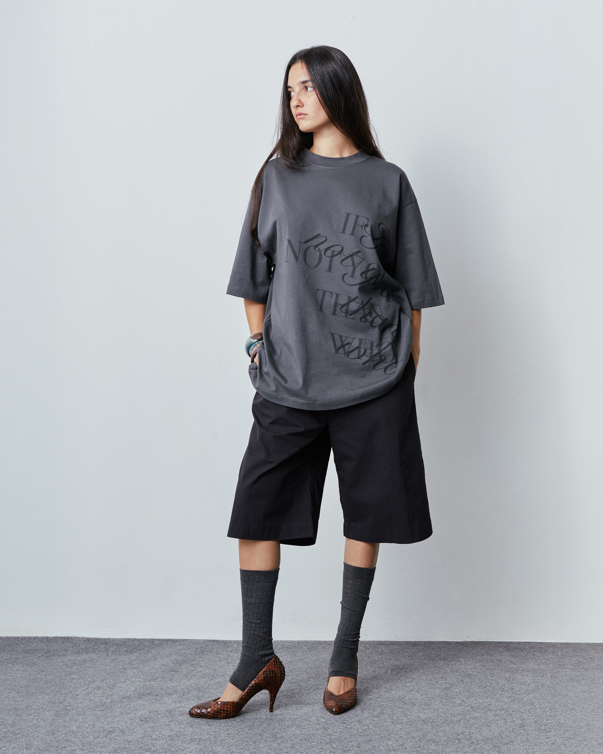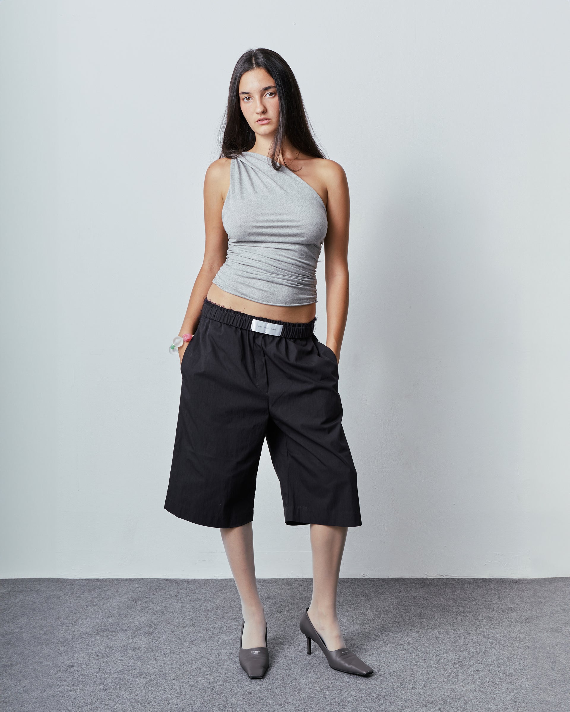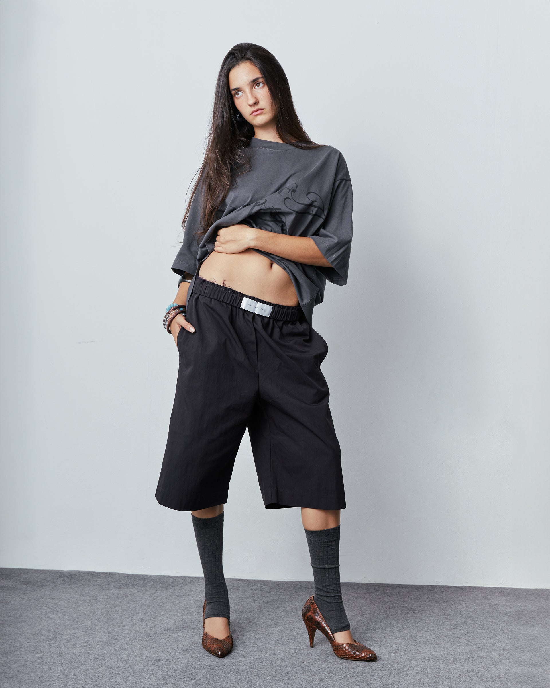 ALEX ANDRA PINTO navy boxer bermuda are made of 100% cotton fabric. Casual relaxed fit shorts with mid-waist and knee length. Detailed with hidden hem, side pockets, faux fly and front label on raw edge elastic waistband for extra comfort.