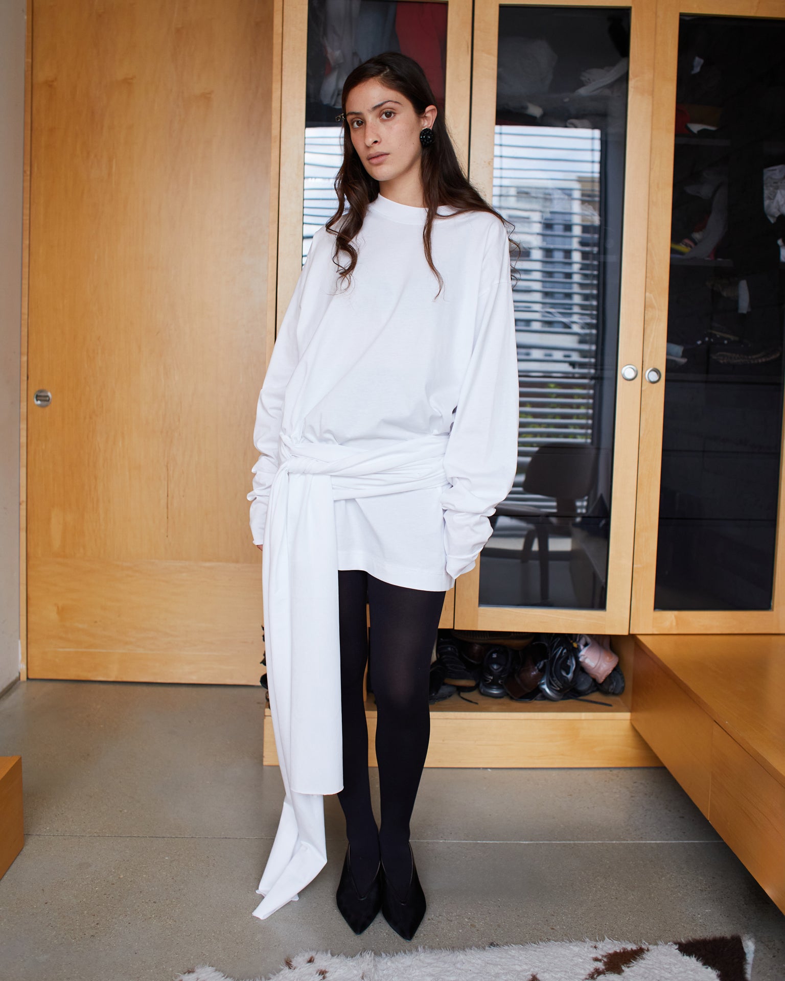 ALEX ANDRA PINTO charcoal grey long sleeves t-shirt crafted from a 100% cotton fabric with an oversized, unisex fit. Detailed with ruched hem in sleeves and optional multi use scarf, can be worn as a t shirt or a mini dress.