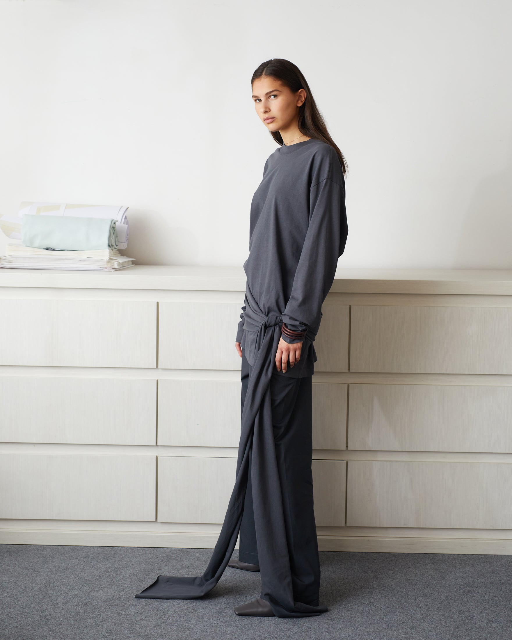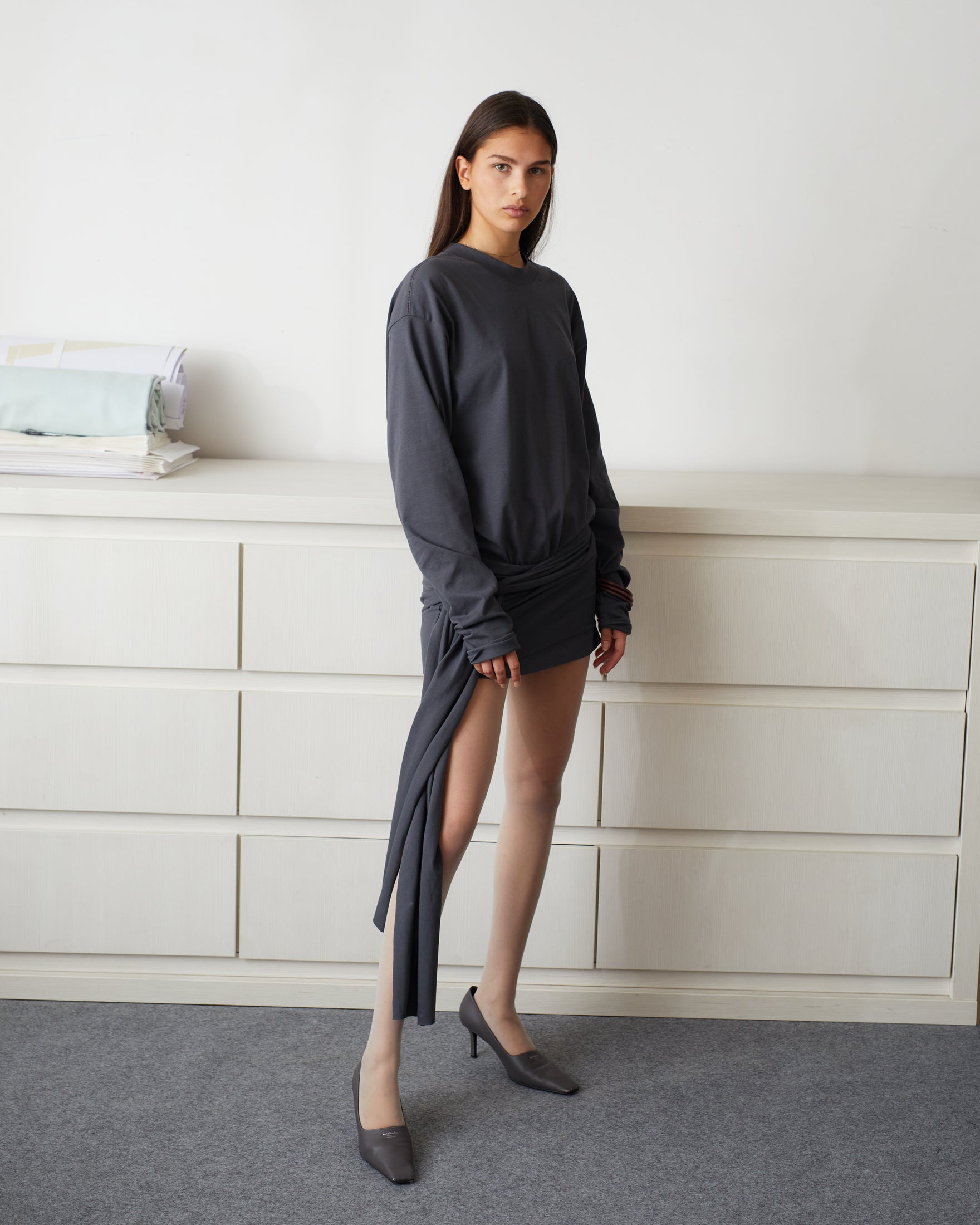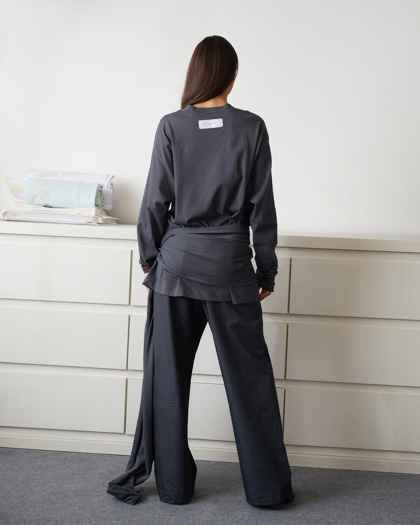 ALEX ANDRA PINTO charcoal grey long sleeves t-shirt crafted from a 100% cotton fabric with an oversized, unisex fit. Detailed with ruched hem in sleeves and optional multi use scarf, can be worn as a t shirt or a mini dress.